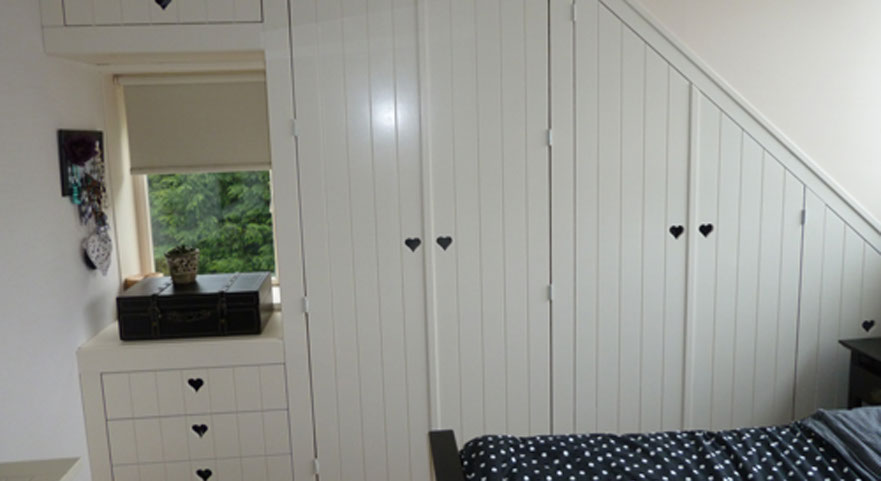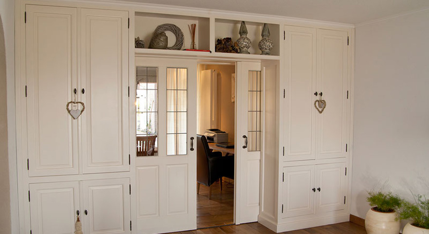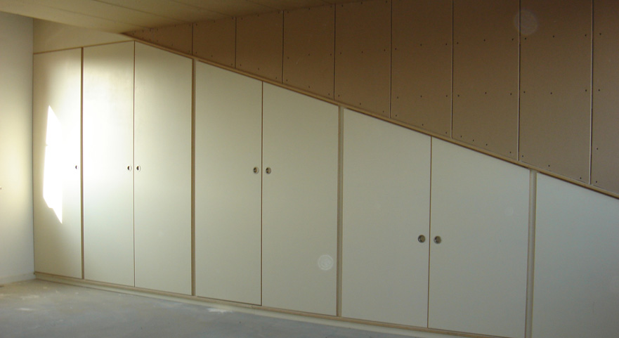 Al deze werkzaamheden worden verzorgd door onze eigen monteurs die alles inmeten en in onze eigen werkplaats op maat voor u maken. Er wordt gewerkt met verschillende materialen en houtsoorten en u heeft de keuze uit een breed scala aan afwerkingen en inrichtingen van de binnenzijde van de kasten.